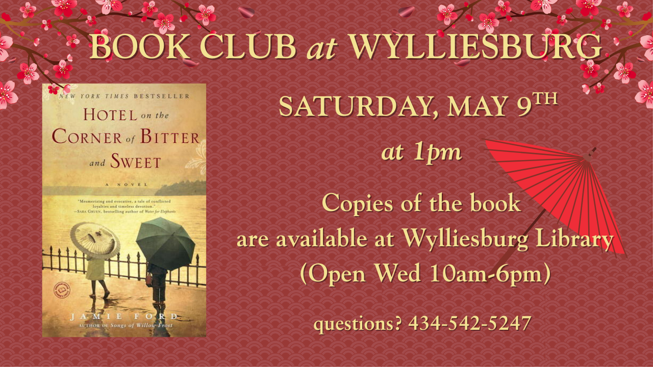 We hope you can join us to discuss this historical romance. Copies of the book are available at the Wylliesburg Branch Library, which is open on Wednesdays from 10am-6pm.